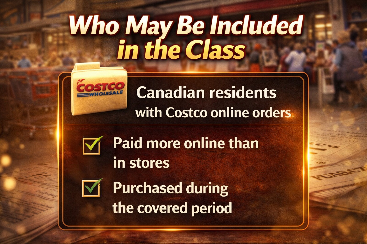 The proposed class includes Canadian residents who bought items online from Costco Canada. Purchases must fall within a set time period defined in the claim. The dates may change if the court adjusts the scope.